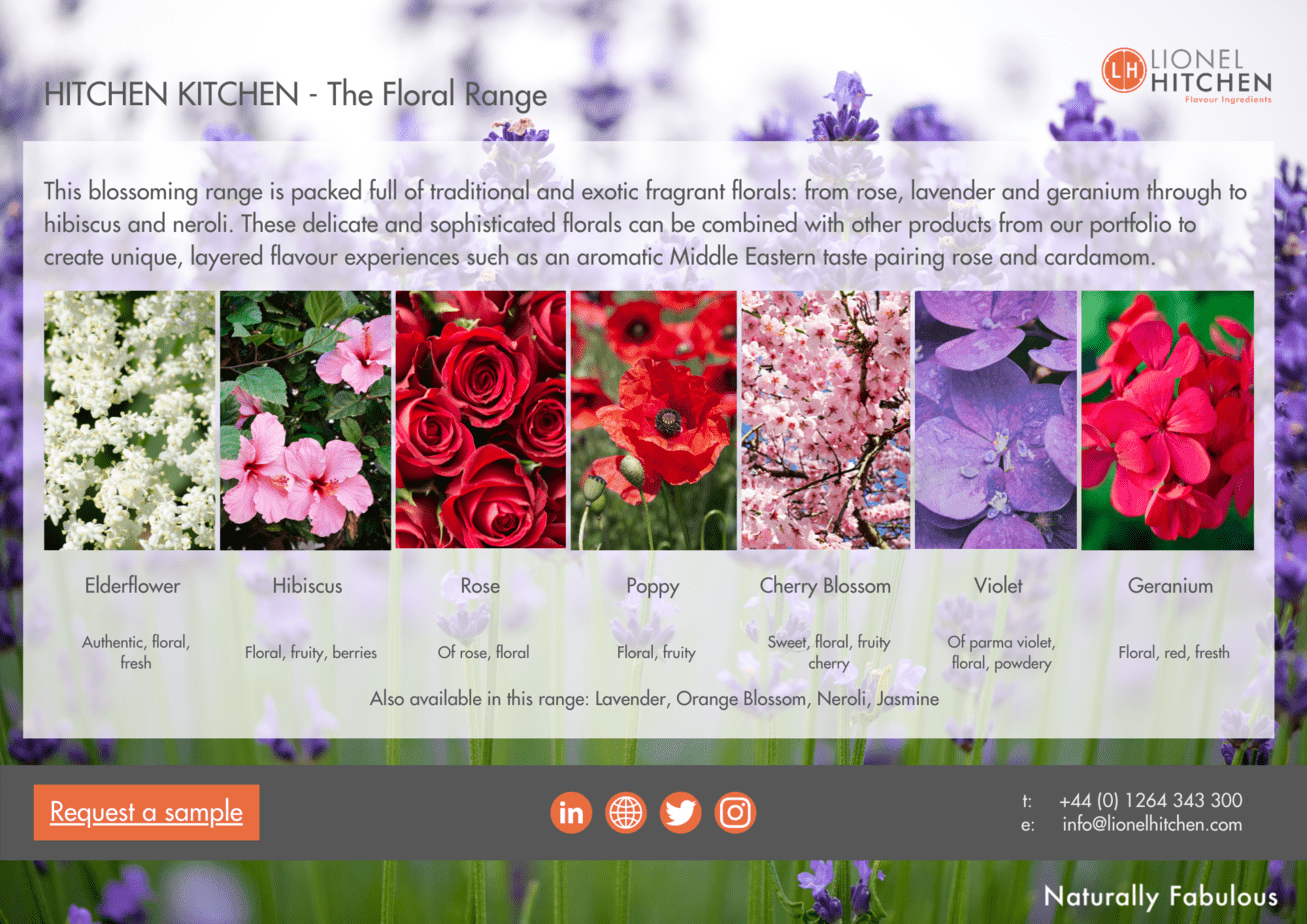 These delicate and sophisticated florals can be combined with other products from our citrus, herb and spice portfolios to create unique, layered flavour experiences. For example, our rose and cardamom paired together create a floral, spicy, aromatic Middle Eastern taste.