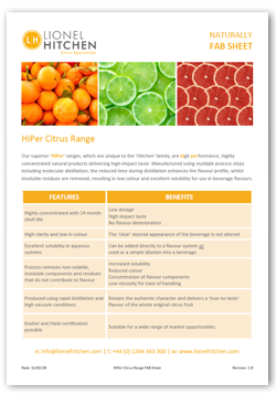 Our superior ‘HiPer’ ranges, which are unique to the ‘Hitchen’ family, are high performance, highly concentrated natural products delivering high-impact taste. Manufactured using multiple process steps including molecular distillation; the reduced time during distillation enhances the flavour profile, whilst insoluble residues are removed, resulting in low colour and excellent solubility for use in beverage flavours.