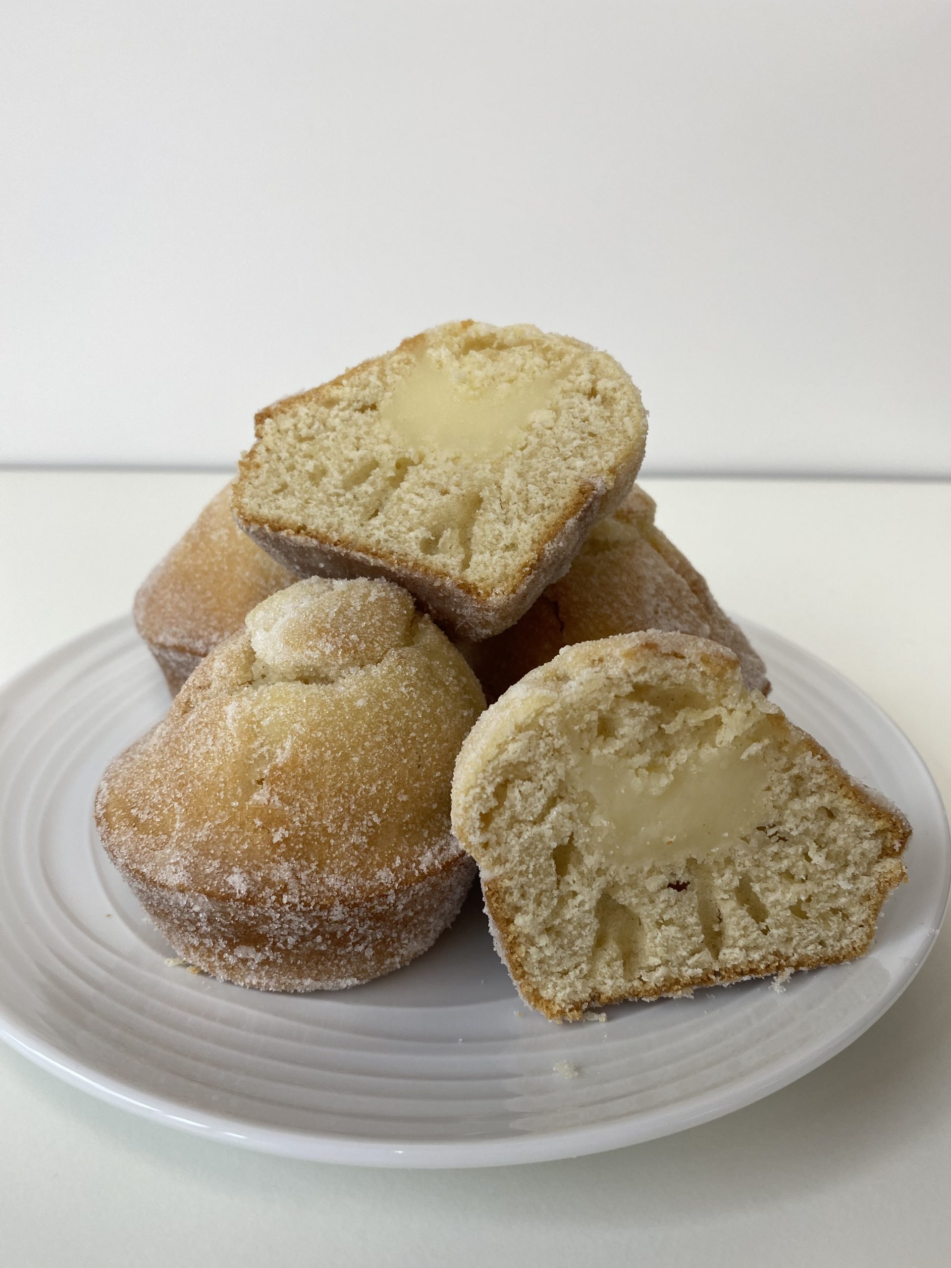 - When they are completelycool fill them with the Blueberry Crème Patisserie. This can be done either with a piping bag and nozzle or by cutting out the core of the duffin and filling it before replacing the top.