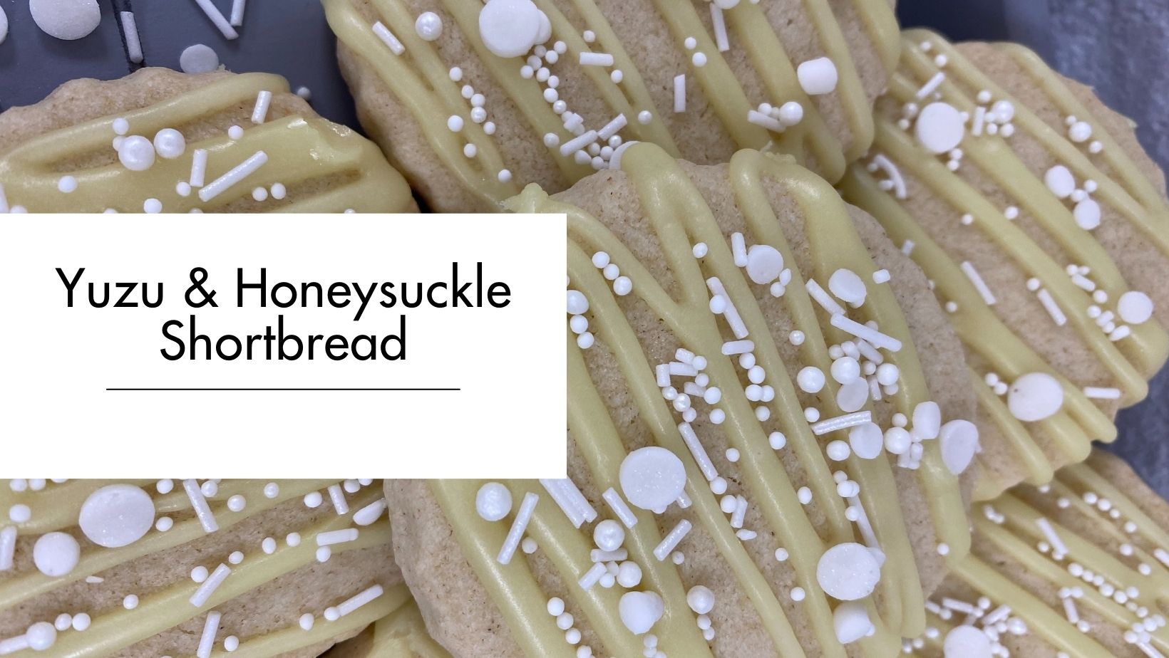 8. Once cool drizzle the yuzu shortbread with honeysuckle flavoured icing, and top with sprinkles.
